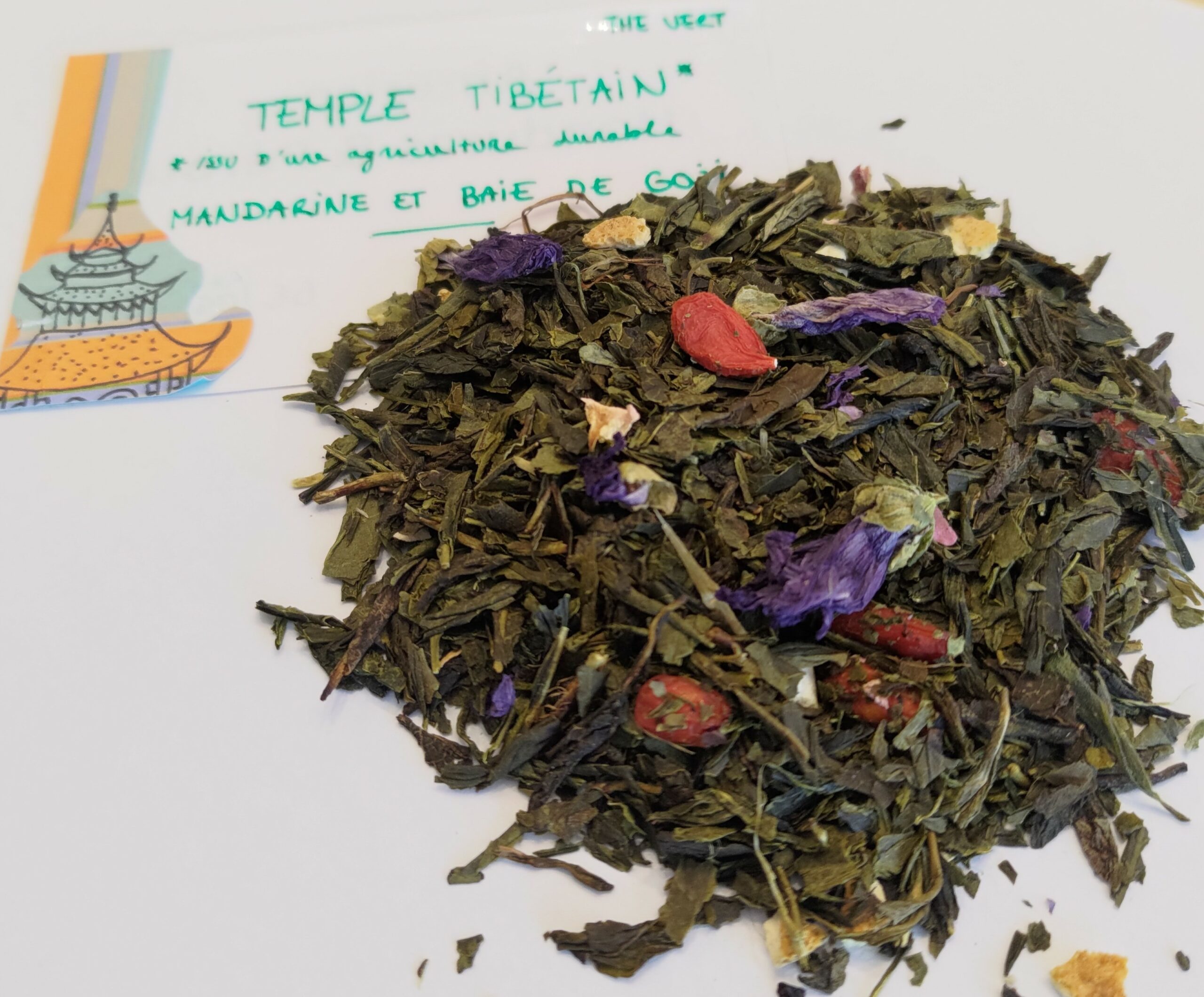 Un thé vert Temple tibétain est un thé doux et fruité sur des notes de mandarine et de baie de goji.